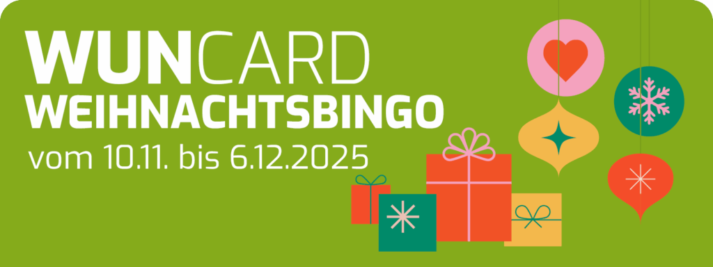 WunCARD Bingo – Spannung auf dem Weihnachtsmarkt! Das WunCARD Bingo startet am 11. November und läuft bis zum 6. Dezember 2025. Ab einem Einkauf von 10 € bei teilnehmenden Akzeptanzstellen sammelst du automatisch mit deiner registrierten WunCARD Bingo-Karten. Um maximal 5 Bingo-Karten zu erhalten, muss in 5 verschiedenen Geschäften eingekauft werden. Live-Bingo auf dem Weihnachtsmarkt […]