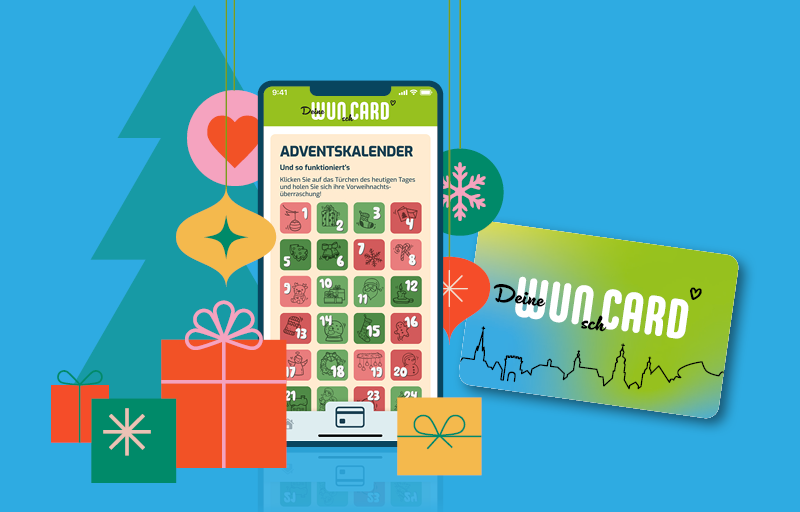 Der WunCARD Adventskalender startet am 1. Dezember. Bis Weihnachten kannst du jeden Tag neue Aktionen deiner Lieblingshändler entdecken. Alles was du dafür tun musst: WunCARD-App runterladen und täglich ein neues Türchen öffnen. Die Angebote der geöffneten Türchen können am jeweiligen Gültigkeitstag einfach durch Vorlage deiner WunCARD beim jeweiligen Händler in Anspruch genommen werden.
